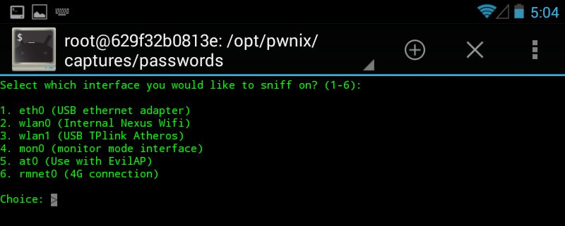 There are two things where Pwn Pad really rocks. The first one is the integrated drivers for the external WiFi with monitor mode and packet injection capabilities. The second cool thing is the chroot wrapper around the Linux hacking tools. Every hacking tool has a start icon, so it feels like it is a native Android application, although it is running in a chroot Kali environment.